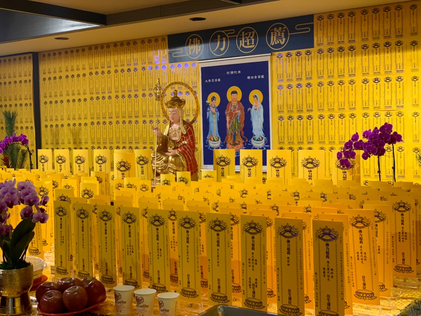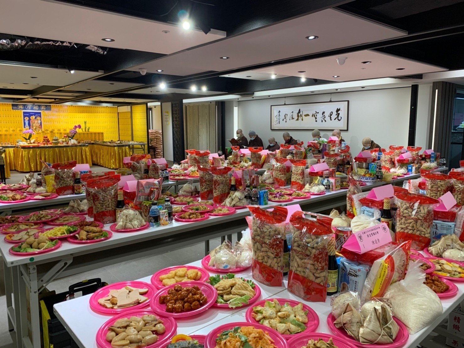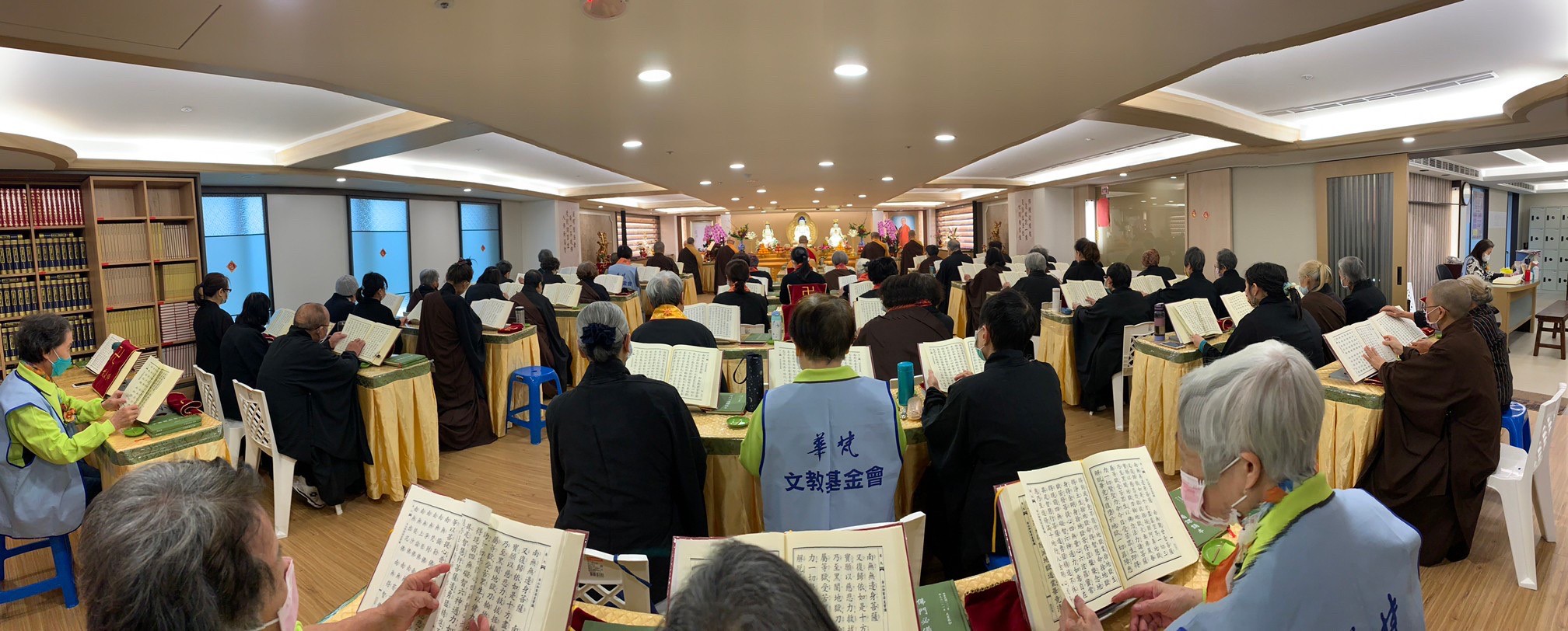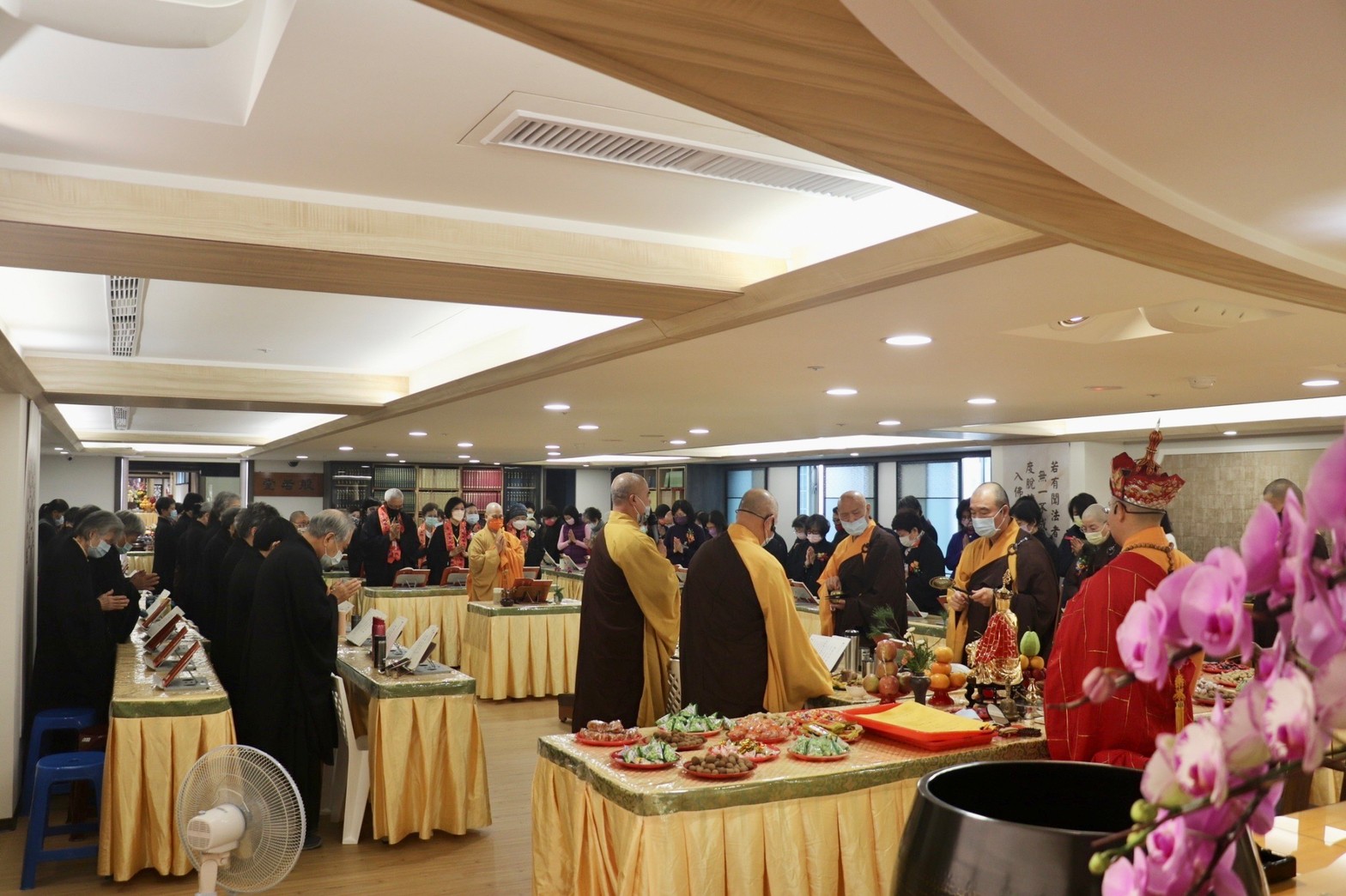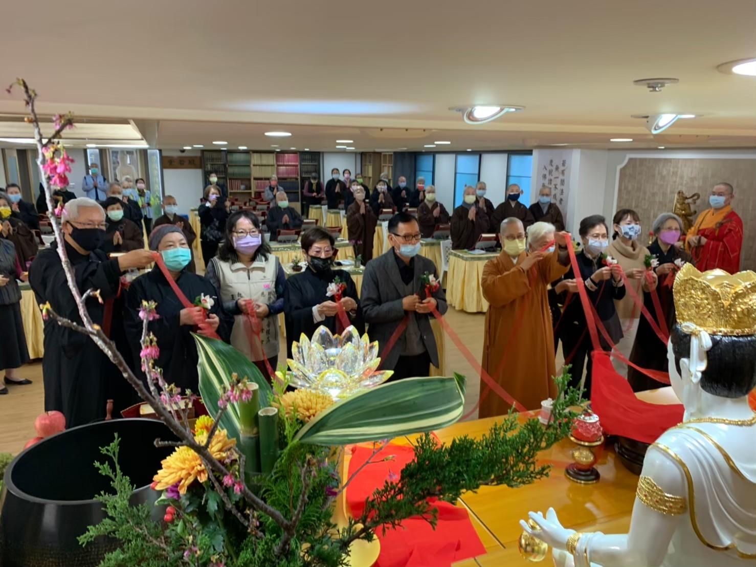 為了舉辦法華三 聖像」安座盛典及《梁 皇寶懺法會,本基金 會的曉雲山人禪藝空間 因為巧思的設計而轉化 為法會道場—設置消災 【福壽祿位區和超薦往 生牌位區。當天下午就 舉辦了《梁皇寶懺》法 會召請,為未來為期五 天的歲末感恩《梁皇寶 懺法會(國曆111 年一月十一日,一月十五日),並於最後一 日(國曆111年一月 十五日)下午三時施放 焰口。祈願法華三聖造像功德,廣利人天,法會虔修禮懺。功德項目有梁皇功德主;消災以及超薦牌位;並可隨喜供花、供果、供燈、供僧;及打齋、和焰口贊普等。十方善信大德踴躍參加共襄盛舉,冥陽兩益,普利大眾,參加者無不法喜充滿。因為寶鳳師姐的團隊在大寮的燉煮炒炸,豐富的供菜得以上供,發心菩薩們同心協力適時的付出上供,以及法師們的誠諷誦經懺,歷時五天的《梁皇寶懺法會終於圓滿結束。也將辛丑年疫情在有驚無恐下劃下完美的句點。